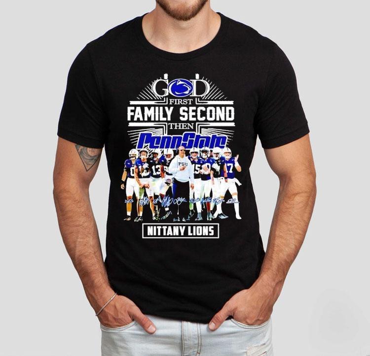 Classic charm, modern edge with God First Family Second Then Penn State Nittany Lions Signatures Shirt, as we navigate through life, it’s important to remember our priorities: God first, family second, and then our passions. For many, one of those passions is being a die-hard fan of the Penn State Nittany Lions. Show your unwavering support with the iconic Penn State Nittany Lions signatures shirt, proudly wearing your love for both football and family.