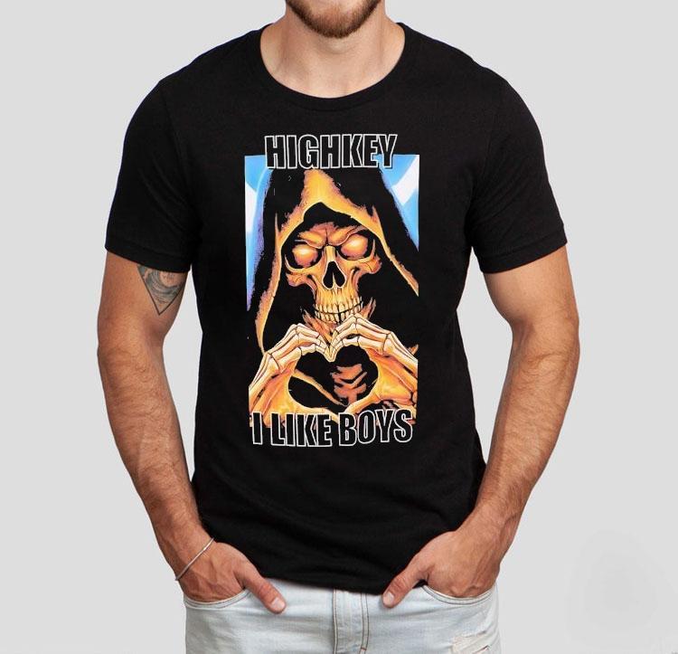 Wardrobe essential, always chic with Grim Reaper Highkey I Like Boys Shirt, as I walked through the halls of Grim Reaper High, my eyes couldn’t help but be drawn to the bold statement on his shirt. “Highkey I Like Boys.” It was a daring declaration that challenged the dark and intimidating reputation of this school. I couldn’t wait to uncover the story behind this shirt and the student who wore it.