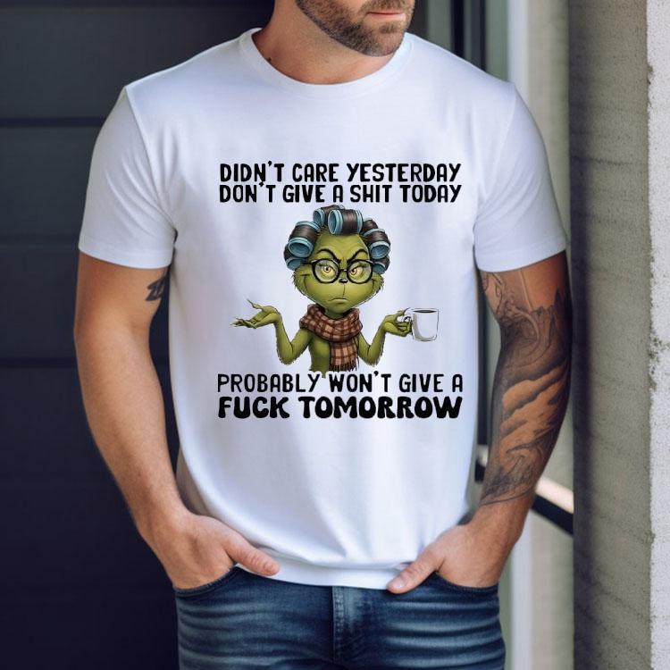 Wardrobe staple, endless style with Grinch Didn’t Care Yesterday Don’t Give A Sht Today Probably Won’t Give A Fck Tomorrow Shirt, the Grinch was notorious for his lack of holiday spirit and care for others, as evidenced by his famous catchphrase, “I don’t care.” But as he proudly dons his new t-shirt reading “Didn’t Care Yesterday, Don’t Give A Sh*t Today, Probably Won’t Give A F*ck Tomorrow,” it’s clear that he’s fully embracing his grumpy persona.