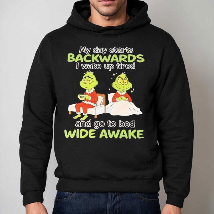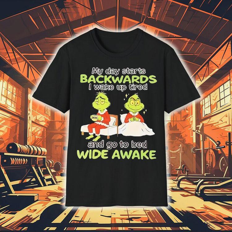 Grinch My Day Starts Backwards I Wake Up Tired And Go To Bed Wide Awake Christmas Shirt