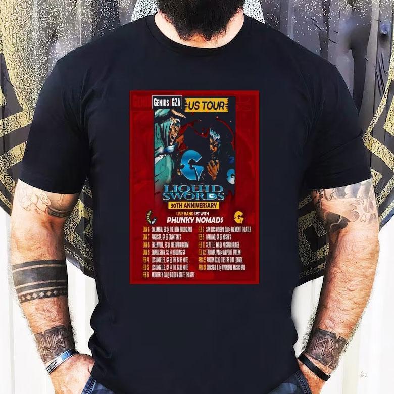 Chic simplicity, everyday elegance with Gza Liquid Swords 30th Anniversary 2026 Us Tour Shirt, get ready to celebrate the iconic album that redefined the hip-hop scene, as Gza’s Liquid Swords turns 30 in 2026. To commemorate this milestone, a limited edition US tour shirt has been released, featuring exclusive artwork that pays homage to the legendary Gza and his groundbreaking album. Don’t miss out on this must-have collector’s item.