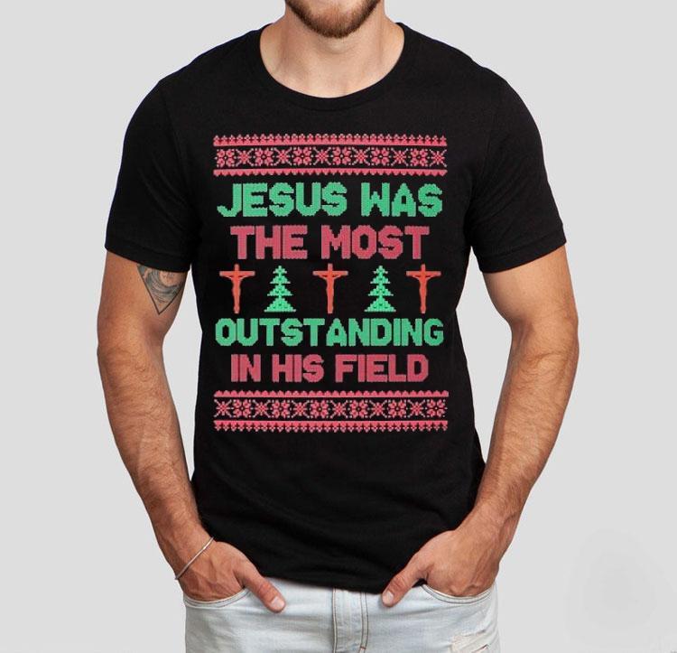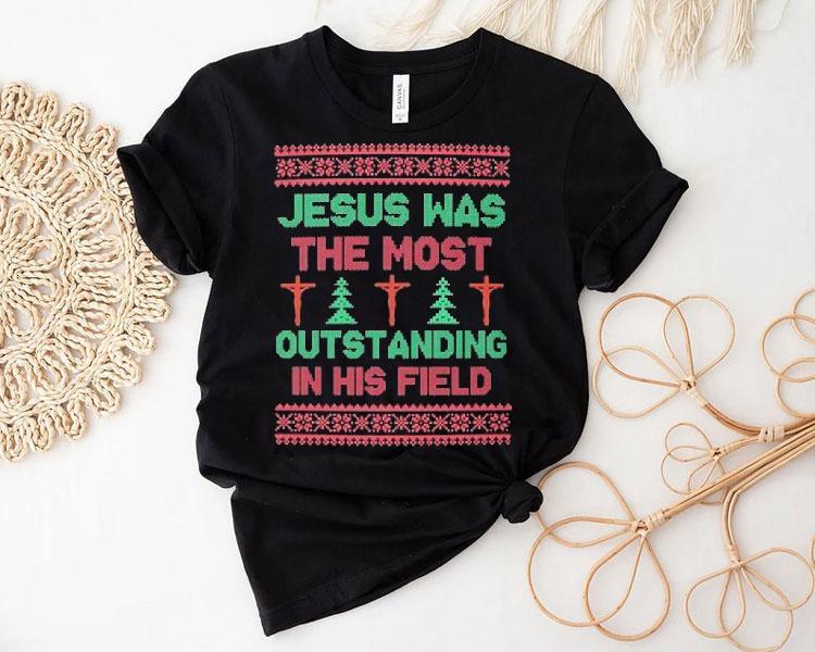 Classic tee, modern comfort with Jesus Was The Most Outstanding In His Field Jesus Ugly Christmas Shirt, celebrate the holiday season with bold fashion and a touch of humor with the Jesus Ugly Christmas Shirt. This unique piece features a colorful graphic of Jesus, the most outstanding figure in history, wearing a festive hat and surrounded by cheerful decorations – perfect for making a statement at any holiday gathering.