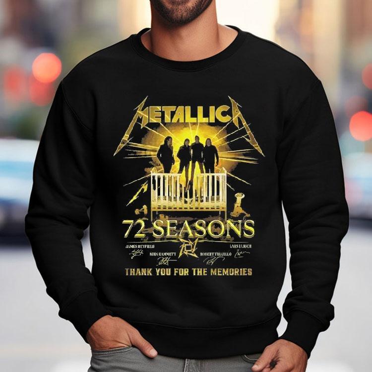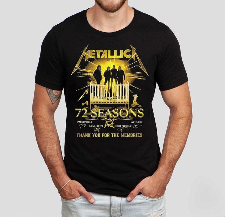 Wear it, love it, repeat with Metallica 72 Seasons James Hetfield And Kirk Hammett And Robert Trujillo And Lars Ulrich Thank You For The Memories Signatures Shirt, with a career spanning 72 seasons, Metallica has become an iconic name in the world of heavy metal. Led by the dynamic duo of James Hetfield and Kirk Hammett, and joined by the talented Robert Trujillo and Lars Ulrich, this band has left an undeniable mark on the music scene. And now, fans can commemorate the band’s legacy with the Metallica Thank You For The Memories Signatures Shirt.