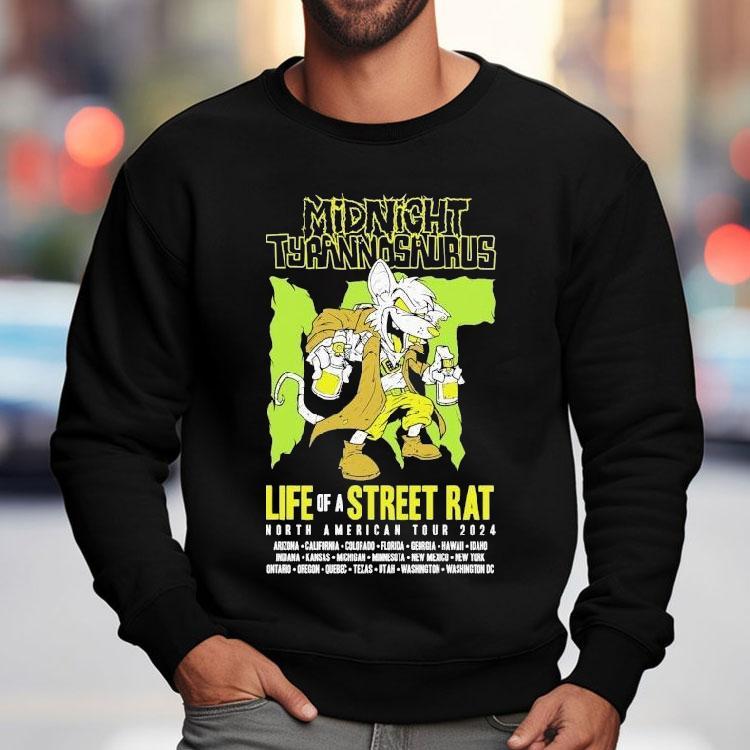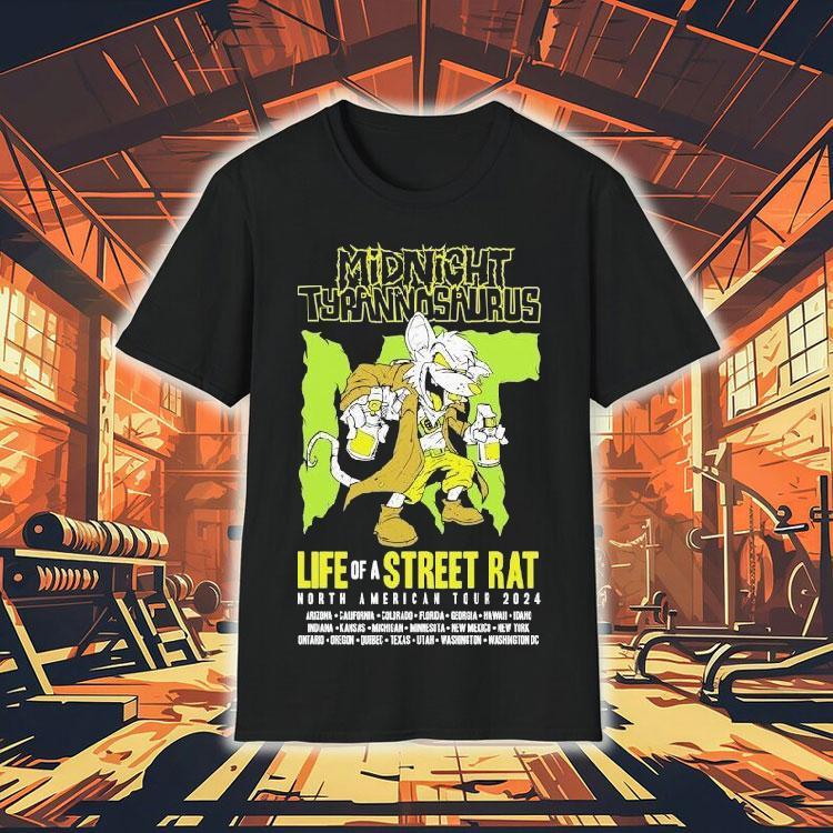 Classic look, contemporary feel with Midnight Tyrannosaurus Life Of A Street Rat Tour 2024 Shirt, the streets are pulsing with energy as the Midnight Tyrannosaurus Life Of A Street Rat Tour 2024 arrives in town. Fans eagerly line up to get their hands on the limited edition shirt, a symbol of the intense energy and wild beats that defined the tour. This is the story of a street rat’s journey through the underground music scene.