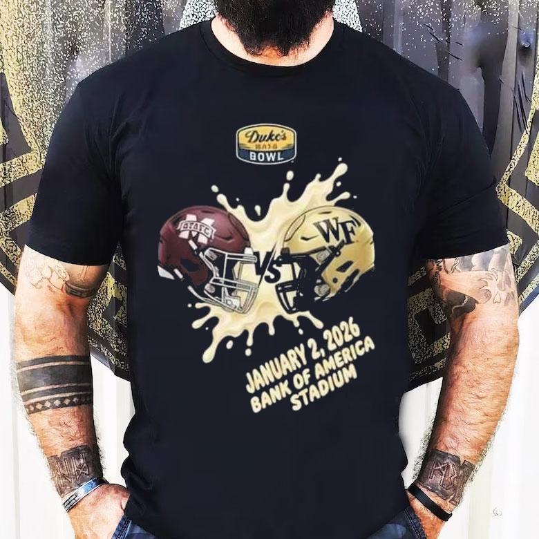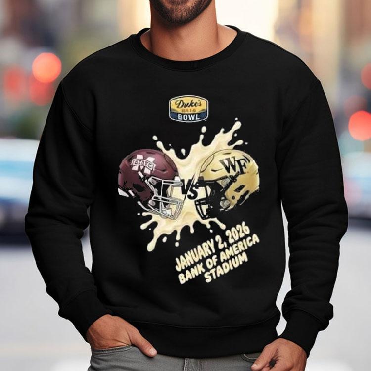 Chic minimalism, everyday wear with Mississippi State Bulldogs Vs Wake Forest Demon Deacons On January 2 2026 Duke’s Mayo Bowl At Bank Of America Stadium Helmet Head To Head Shirt, get ready college football fans, because two powerhouse teams will go head-to-head on January 2, 2026 at the Duke’s Mayo Bowl at Bank of America Stadium. The Mississippi State Bulldogs and the Wake Forest Demon Deacons will battle it out in a highly anticipated match, with fans donning their helmet head to head shirts to represent their team.