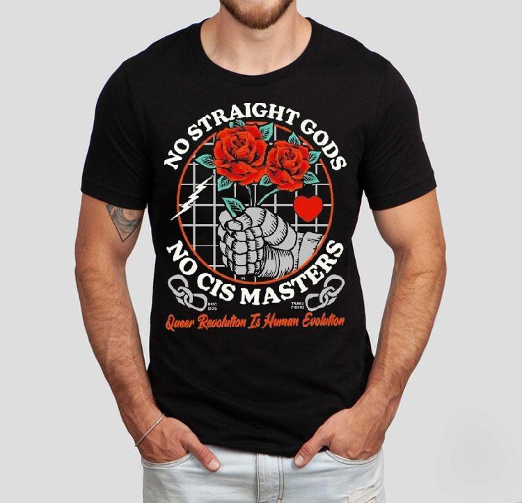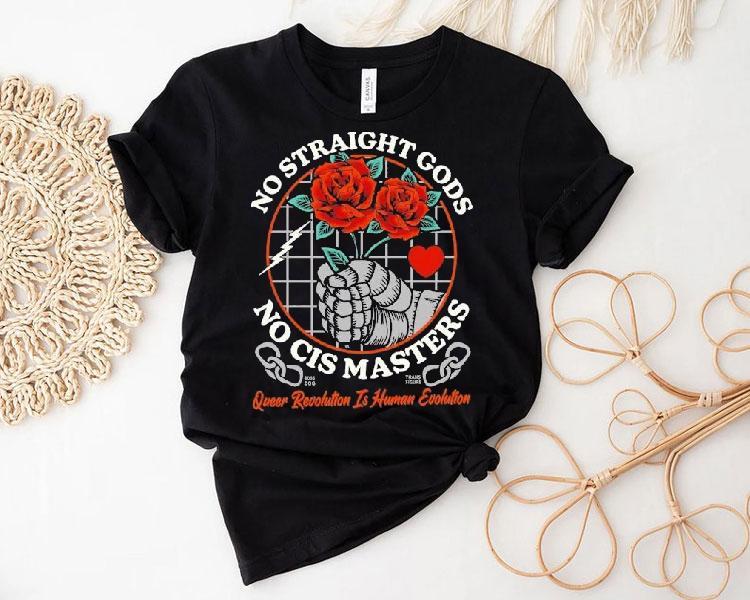 Chic simplicity, everyday charm with No Straight Gods No Cis Masters Queer Revolution Is Human Evolution Rose Hands Shirt, in a world where discrimination and inequality still runs rampant, the call for a queer revolution grows louder each day. The mantra “No Straight Gods, No Cis Masters” echoes through the streets as a reminder that true equality means dismantling oppressive systems. And through it all, the rose hands shirt stands as a symbol of hope and unity in the fight for human evolution.