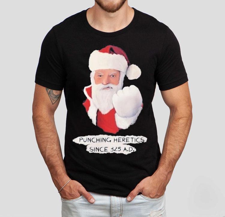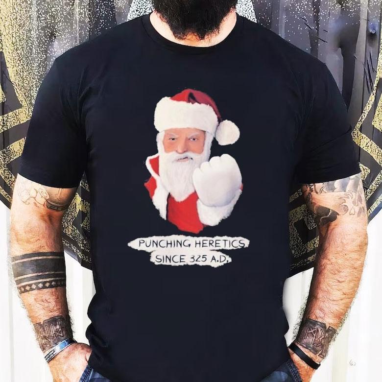 Essential wardrobe staple with Santa Punching Heretics Since 325 Ad Christmas Shirt, “In the spirit of giving, Santa trades in his traditional red and white suit for a bold new look this year. With the words ‘Santa Punching Heretics Since 325 AD’ emblazoned on his Christmas shirt, he’s ready to defend the holiday against naysayers and spread the true message of the season.”
