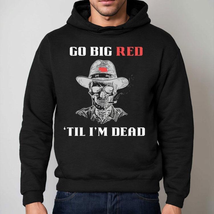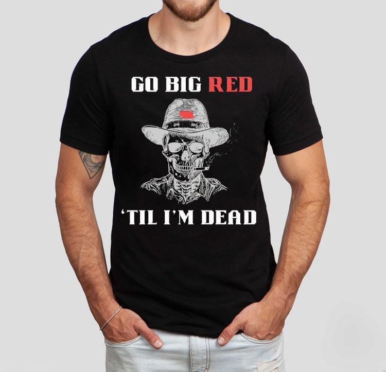 Uncomplicated elegance with Skeleton Smoking Go Big Red ’til I’m Dead Shirt, as the cool fall breeze sweeps through the streets, a skeleton can be seen lounging on the steps of a local university, puffing on a cigarette. In his bony hand, he proudly holds up a “Go Big Red ’til I’m Dead” shirt, showing his undying loyalty to his alma mater.