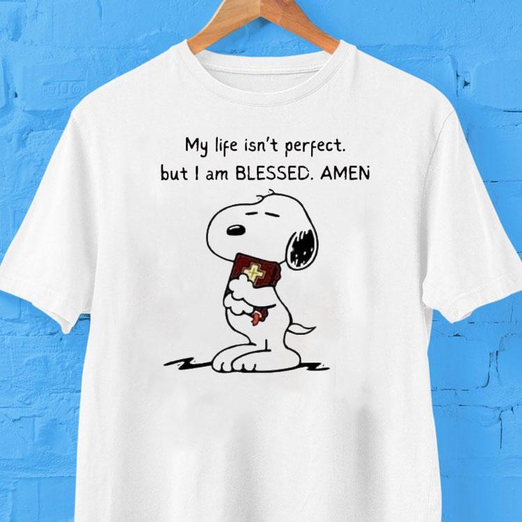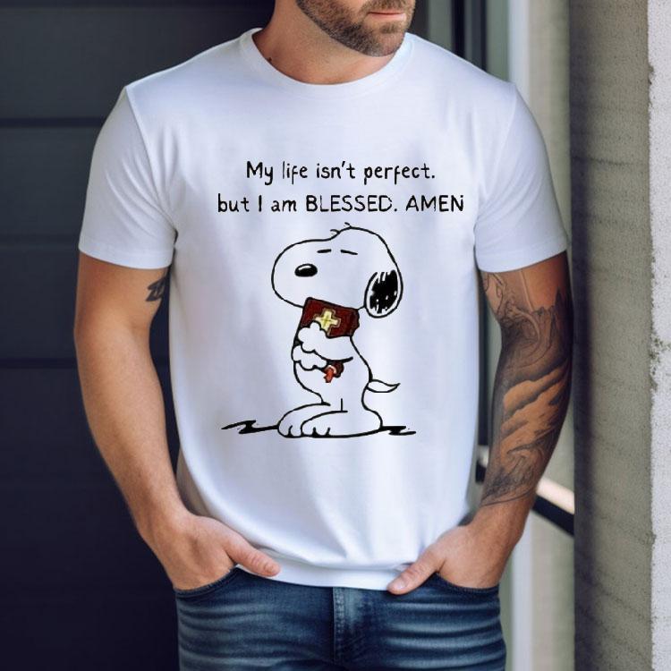 Chic minimalism, always with Snoopy The Peanuts My Life Isn’t Perfect But I Am Blessed Amen Shirt, “Snoopy from The Peanuts may have been a cartoon dog, but his simple outlook on life and loyal companionship has left a lasting impression on many. Just like Snoopy, we may not have a perfect life, but the blessing of good friends and family make it all worthwhile. Celebrate this sentiment with our “My Life Isn’t Perfect But I Am Blessed Amen” shirt. See the world through Snoopy’s eyes.”