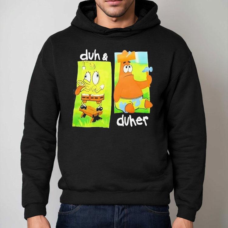 Uncomplicated style choice with Squarepants And Patrick Star Duh And Duher Shirt, being the ultimate duo in the underwater world of Bikini Bottom, SpongeBob SquarePants and his loyal best friend Patrick Star are not only known for their hilarious antics, but also for their unique sense of style. And what better way to show off their friendship than with their matching “Duh” and “Duher” shirts?