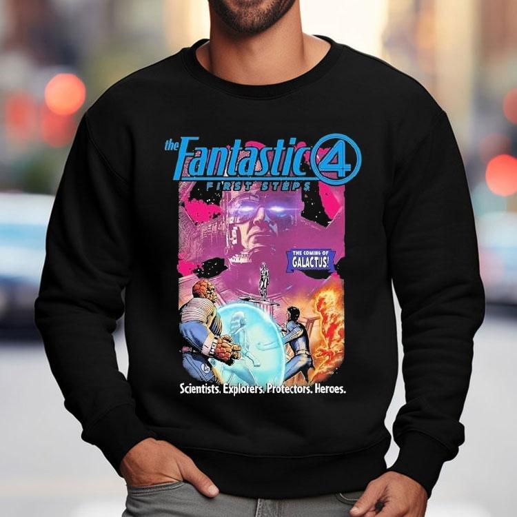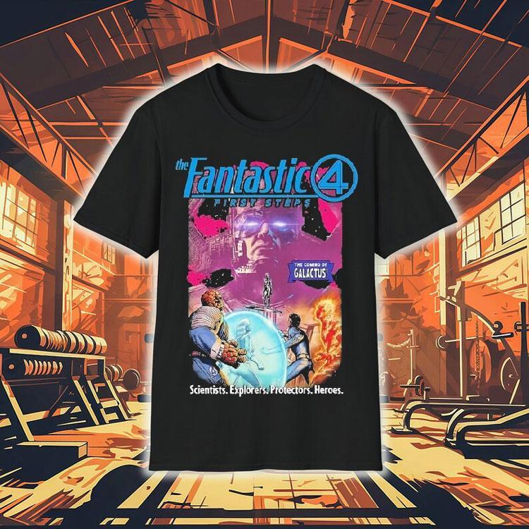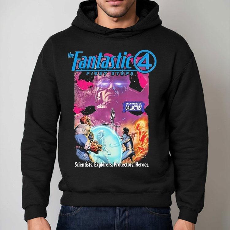 Wardrobe must-have with The Coming Of Galactus The Fantastic 4 First Steps Scientists Explorers Protectors Heroes Shirt, the world was on the brink of destruction as the ominous presence of Galactus loomed over it. The only hope for humanity rested on the shoulders of four individuals: the Fantastic 4. These scientists, explorers, protectors, and heroes were determined to save the world, their shirts emblazoned with their iconic symbol.