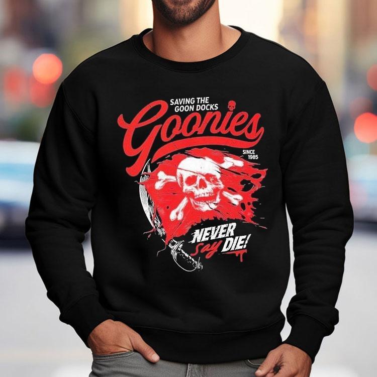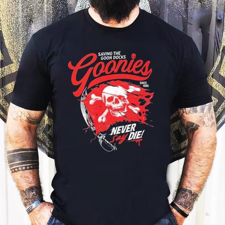 Casual comfort, chic look with The Goonies Saving The Goon Docks Never Say Die Since 1985 Skull Shirt, in 1985, a group of adventurous kids known as The Goonies set out on a mission to save their beloved neighborhood, The Goon Docks. Their determined spirit and iconic motto “Never Say Die” has been immortalized on the famous Skull Shirt, reminding us all of the power of friendship, courage, and never giving up.