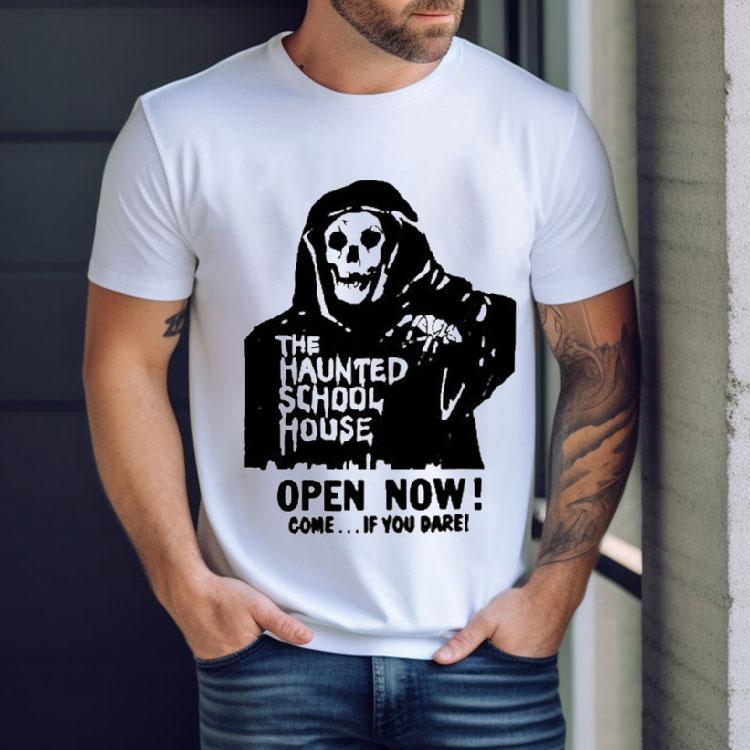 Classic tee, modern twist with The Haunted School House Open Now Come If You Dare Horror Movie Shirt, welcome horror lovers! The Haunted School House is now open and waiting for all brave souls to enter. But beware, this is not your average haunted attraction. This is a real-life horror experience that will leave you trembling and screaming for more. And don’t forget to grab your “Come If You Dare” horror movie shirt as a souvenir.