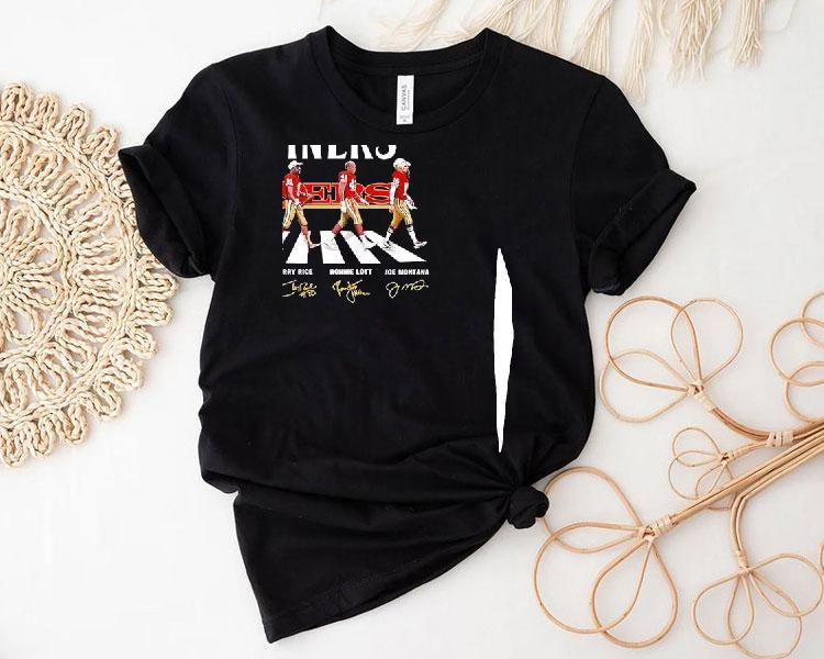 The San Francisco 49ers Young Rice Lott Montana Walking Across Signatures Shirt